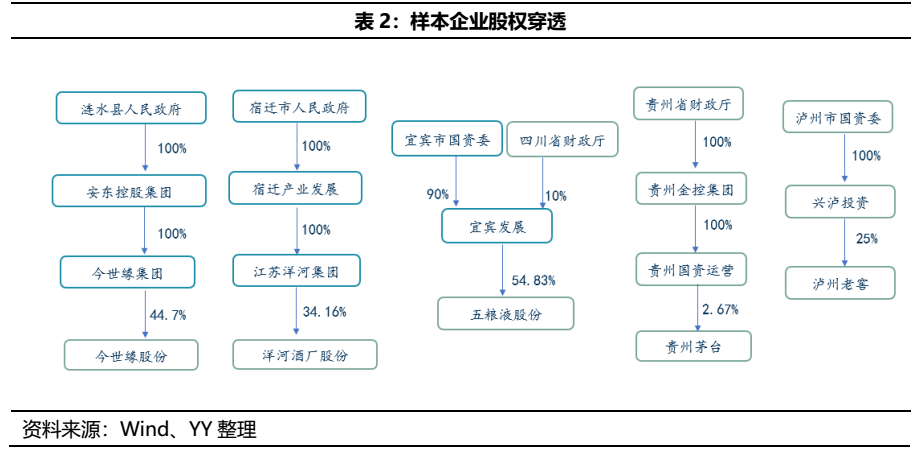首先,需要關(guān)注產(chǎn)投平臺(tái)對(duì)白酒企業(yè)的控制力,這關(guān)系到平臺(tái)對(duì)優(yōu)質(zhì)白酒資產(chǎn)的騰挪能力。樣本企業(yè)中,安東控股、宿遷產(chǎn)業(yè)和宜賓發(fā)展都是白酒企業(yè)的母公司,興瀘投資是瀘州老窖的二股東,貴州國(guó)資運(yùn)營(yíng)是小比例股權(quán)獲得茅臺(tái)股權(quán)的無償劃轉(zhuǎn)。