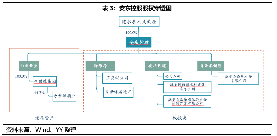安東控股通過今世緣集團(tuán)間接持股今世緣44.74%的股份,實(shí)控人為漣水縣人民政府。主營(yíng)業(yè)務(wù)可以分為白酒和城投兩大板塊,城投業(yè)務(wù)主要包括保障房、委托代建和自來水銷售,其中母公司主要負(fù)債委托代建。