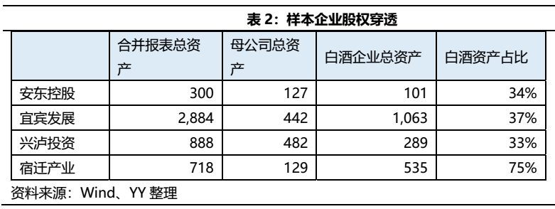 此外,需要從母公司層面追溯主要融資投向和資產(chǎn)形成。從財(cái)務(wù)特征來看,白酒類產(chǎn)投平臺(tái)的合并報(bào)表普遍失真,白酒更多是作為美化報(bào)表的作用。由于產(chǎn)投平臺(tái)并表或持股優(yōu)質(zhì)白酒公司,且旗下通常由不同的子公司負(fù)責(zé)不同業(yè)務(wù)板塊的經(jīng)營(yíng),母公司的資產(chǎn)規(guī)模遠(yuǎn)遠(yuǎn)不及合并口徑的資產(chǎn)規(guī)模,資產(chǎn)質(zhì)量與優(yōu)質(zhì)白酒股權(quán)也存在不同程度的極差。