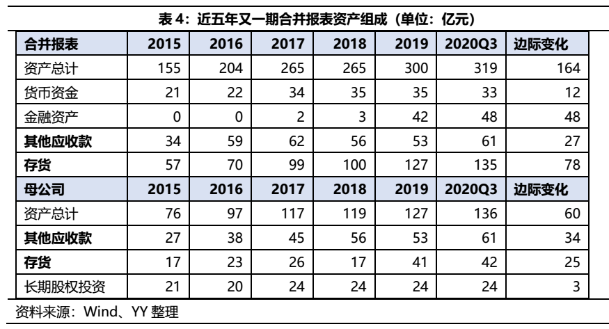 2015到2020Q3,從資產(chǎn)端來看,母公司主要的變動(dòng)科目是其他應(yīng)收款和存貨,分別增加了34億元和25億元,對(duì)應(yīng)負(fù)債端,主要是其他應(yīng)付款和有息負(fù)債,分別為28億元和24億元。