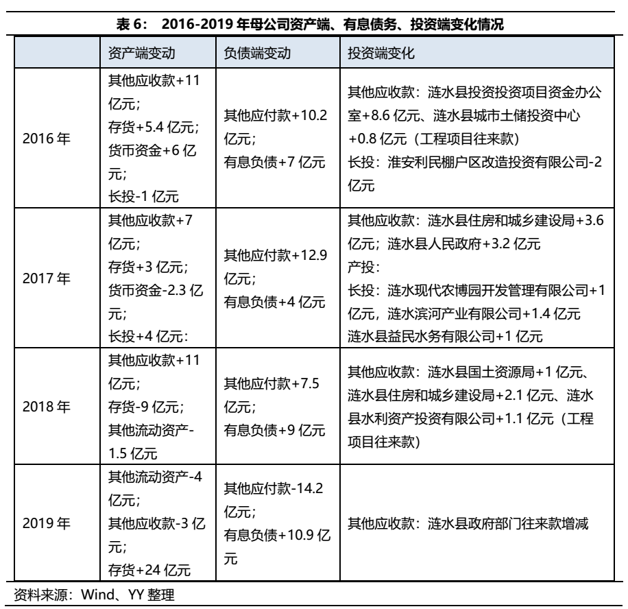 母公司的主要資產(chǎn)構(gòu)成中,存貨主要系工程施工項(xiàng)目未結(jié)轉(zhuǎn)成本,資金占用量大且回款不明,其他應(yīng)收款主要債務(wù)人為漣水縣政府部門,而長(zhǎng)期股權(quán)投資則主要是公司持有的今世緣股份,母公司主營(yíng)工程施工業(yè)務(wù),承擔(dān)了漣水縣內(nèi)許多基礎(chǔ)設(shè)施建設(shè)項(xiàng)目,因此公司近年來資金主要流向了城投業(yè)務(wù)。