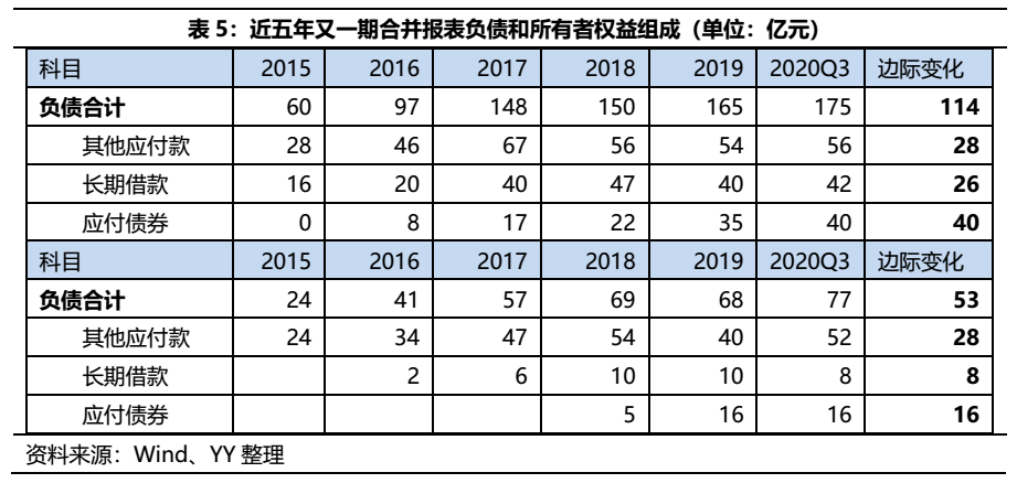 因此,無論從負(fù)債端還是資產(chǎn)端,由于白酒股權(quán)對(duì)報(bào)表的美化作用,母公司的報(bào)表更為獨(dú)立,故下文將進(jìn)一步追溯母公司近五年的報(bào)表組成,分析公司的舉債和資產(chǎn)形成過程。