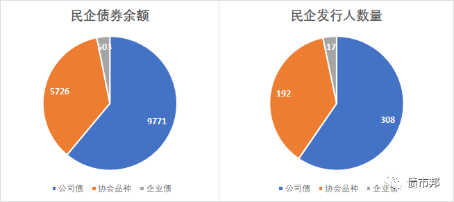 從存量上來看,民企發(fā)行人的數量是公司債(308家)>協會品種(192家)>企業(yè)債(17家);民企債券余額是公司債(9771億元)>協會品種(5726億元)>企業(yè)債(503億元)。