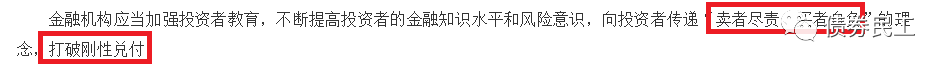 目前監(jiān)管機(jī)構(gòu)對非標(biāo)產(chǎn)品剛性兌付問題指導(dǎo)意見最明確的文件是人民銀行、銀保監(jiān)會、證監(jiān)會和外匯局于2018年聯(lián)合印發(fā)的《關(guān)于規(guī)范金融機(jī)構(gòu)資產(chǎn)管理業(yè)務(wù)的指導(dǎo)意見》(銀發(fā)[2018]106號)(以下簡稱“指導(dǎo)意見”)。指導(dǎo)意見明確提出了要打破剛性兌付。需要注意的是,指導(dǎo)意見中的剛性兌付的內(nèi)涵實(shí)際上是包括兩個方面的內(nèi)容:一是賣者盡責(zé),二是買者自負(fù)。也就是說金融機(jī)構(gòu)需要放棄剛性兌付的包袱,而投資者則需要接受投資所帶來的潛在風(fēng)險。