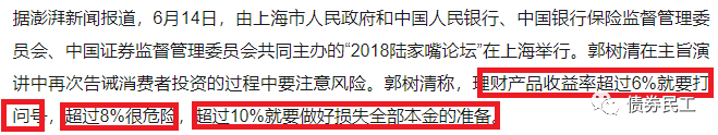 單純的從非標(biāo)市場來看,投資者是市場上的稀缺資源,是各類金融機(jī)構(gòu)爭取的優(yōu)質(zhì)客戶。從現(xiàn)有的公開信息來看,金融機(jī)構(gòu)是實(shí)際上很難履行投資者教育相關(guān)工作,讓投資者充分認(rèn)識到金融產(chǎn)品可能存在的風(fēng)險和問題。因此,投資者對于非標(biāo)產(chǎn)品“買者自負(fù)”的可能并未達(dá)到監(jiān)管的要求。這里我們再重溫一下郭主席的講話“理財(cái)產(chǎn)品收益率超過6%就要打問號,超過8%很危險,超過10%就要做好損失全部本金的準(zhǔn)備”。