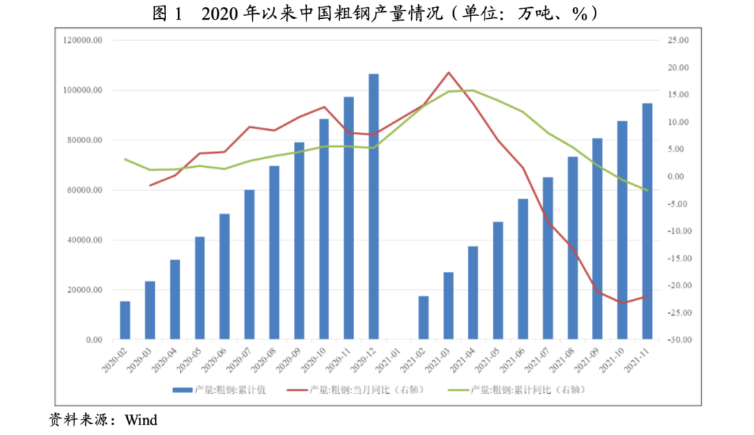 2021年1―11月,中國生鐵、粗鋼和鋼材產(chǎn)量分別為79623萬噸、94636萬噸和122333萬噸,同比分別下降4.20%、下降2.60%和增長1.00%。從月度走勢看,自2021年4月開始月度粗鋼產(chǎn)量增速有所放緩,7月起月度粗鋼產(chǎn)量同比增速由正轉(zhuǎn)負,且降幅不斷擴大,主要系下游需求轉(zhuǎn)弱以及限產(chǎn)施壓所致。