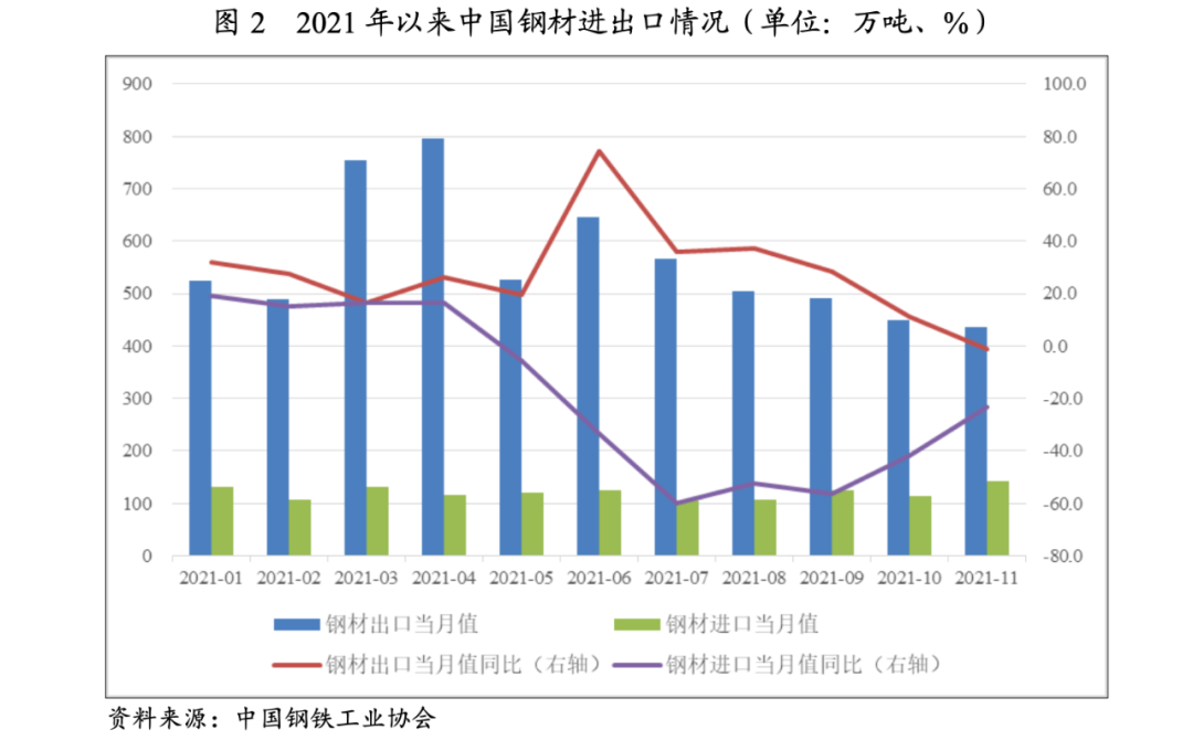 進出口方面,2021年1―11月,中國累計出口鋼材6187.5萬噸,同比增長26.7%,月度出口量呈現(xiàn)沖高回落態(tài)勢。其中,5月份環(huán)比大幅下降主要系5月1日起國家取消部分鋼材退稅政策以及國內(nèi)外鋼材價差縮小所致。同期,中國累計進口鋼材1326.7萬噸,同比下降29.6%,月度進口量環(huán)比變動不大。
