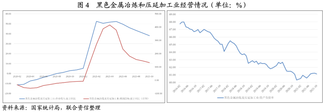 2021年以來,受政策調(diào)控影響,月度粗鋼產(chǎn)量呈現(xiàn)先增后降趨勢,1―11月累計粗鋼產(chǎn)量出現(xiàn)同比下降,預計全年可實現(xiàn)減產(chǎn)目標;鋼材價格先升后降,整體處于歷史高位,行業(yè)效益大幅上升,資產(chǎn)負債率處于歷史較低水平。