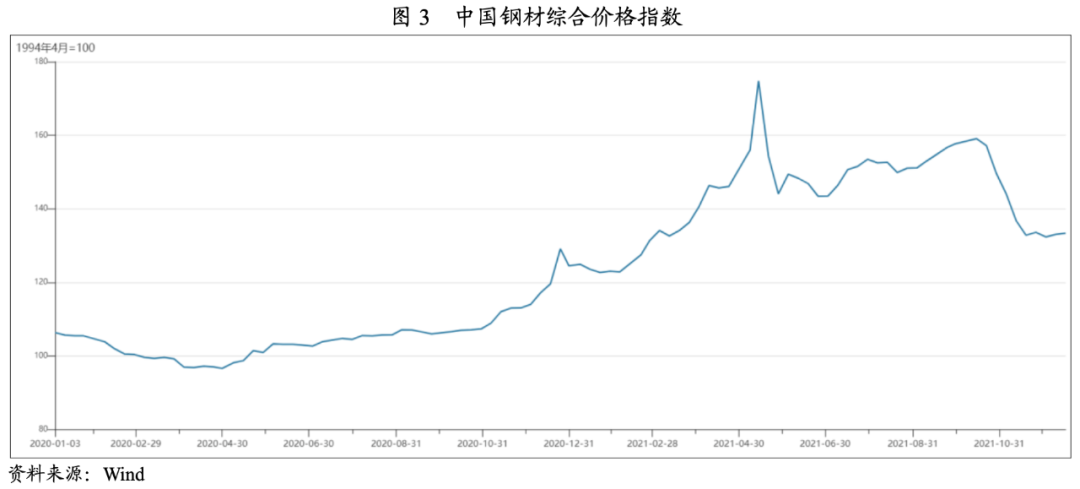 價格方面,2021年以來鋼材價格呈現(xiàn)先升后降、大幅波動態(tài)勢,但整體處于歷史高位。具體來看,2021年一季度受通脹預期以及成本抬升影響,鋼材價格開啟上漲趨勢;二季度,河北等地環(huán)保限產(chǎn),同時疊加下游用鋼需求和投機需求旺盛,供需緊張推動鋼材價格持續(xù)上漲,并于5月漲至歷史高點;此后,隨著國家出臺了一系列調(diào)控政策以及下游需求放緩,鋼材價格有所回落,但由于原材料焦炭價格快速攀升至歷史高位,對鋼材價格形成一定支撐;10月底以來,焦炭價格在政府干預下明顯下降,同時疊加用鋼需求下降,鋼材價格大幅回落,但仍高于去年同期水平。
