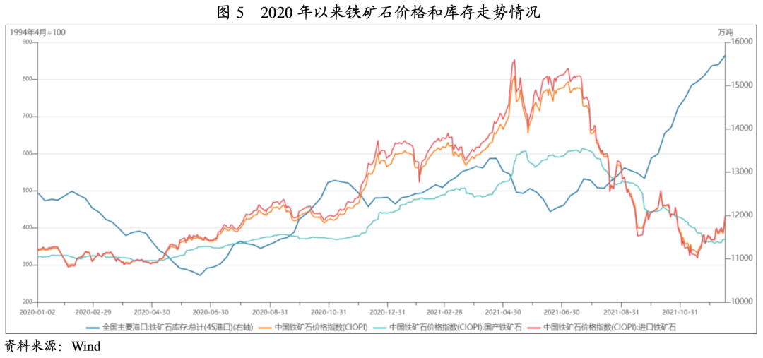 2021年以來,鐵礦石和焦炭價格波動明顯,且整體處于較高水平,不利于鋼鐵企業(yè)成本控制;下游鋼材表觀消費量先增后降,建筑業(yè)和制造業(yè)用鋼需求有所分化。