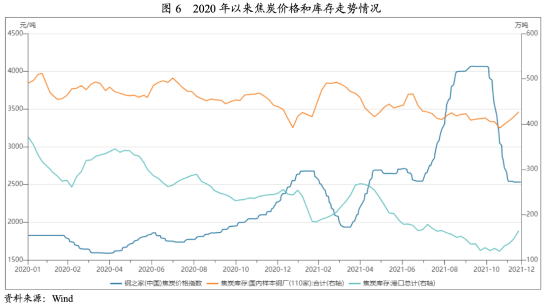 焦炭是支撐鋼鐵生產(chǎn)的基本原材料,中國鋼鐵行業(yè)焦炭供給主要來自國內(nèi)煤炭企業(yè)。2021年上半年,煤炭生產(chǎn)受“雙碳”政策、環(huán)保要求、安全事故等多因素影響,焦炭供需出現(xiàn)錯配,焦炭價格波動較大。其中,3―4月,由于新焦爐陸續(xù)投產(chǎn),加之河北地區(qū)鋼鐵限產(chǎn),焦炭價格快速下跌。之后,環(huán)保限產(chǎn)、能耗雙控、焦煤進口受限等因素影響焦炭企業(yè)產(chǎn)量釋放,焦炭價格大幅上漲。但10月底以來,煤炭保供政策持續(xù)發(fā)力,焦炭庫存止跌反升,焦炭價格高位回落,但仍處于歷史較高水平。