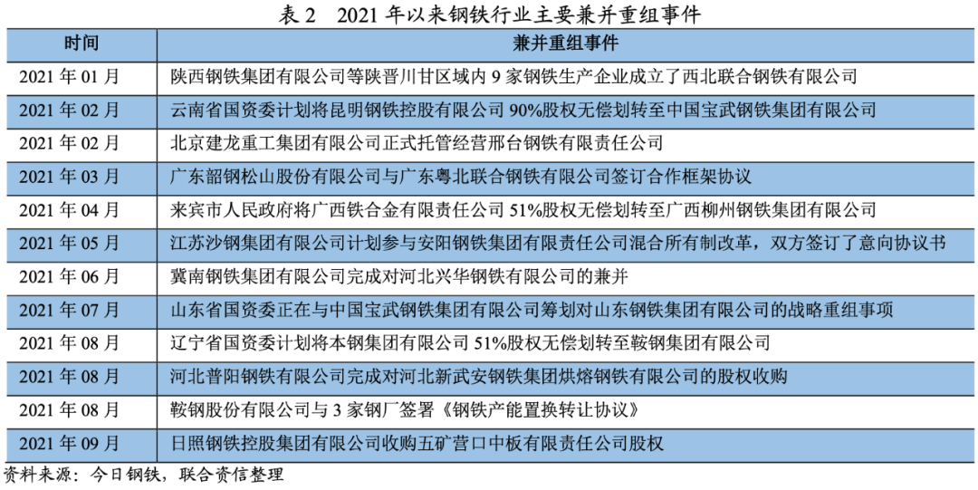 中國鋼鐵生產(chǎn)和消費有區(qū)域性特征,區(qū)域整合是鋼鐵行業(yè)實現(xiàn)結(jié)構(gòu)優(yōu)化和集中度提升的基礎(chǔ),2021年以來鋼鐵企業(yè)兼并重組的步伐明顯加快。其中,鞍鋼集團有限公司重組本鋼集團有限公司,以6300萬噸/年的粗鋼產(chǎn)能成為國內(nèi)第二大鋼企;中國寶武鋼鐵集團有限公司擬重組山東鋼鐵集團有限公司,產(chǎn)能規(guī)模將增至1.5億噸/年。在龍頭企業(yè)全國化布局的同時,不少中小型鋼鐵企業(yè)的兼并重組也動作頻頻。國內(nèi)鋼鐵企業(yè)數(shù)量眾多,產(chǎn)能規(guī)模的差距也非常大,行業(yè)要形成有序的競爭格局,僅僅依靠龍頭企業(yè)的兼并重組還不夠,區(qū)域性小企業(yè)的整合也是必經(jīng)之路。