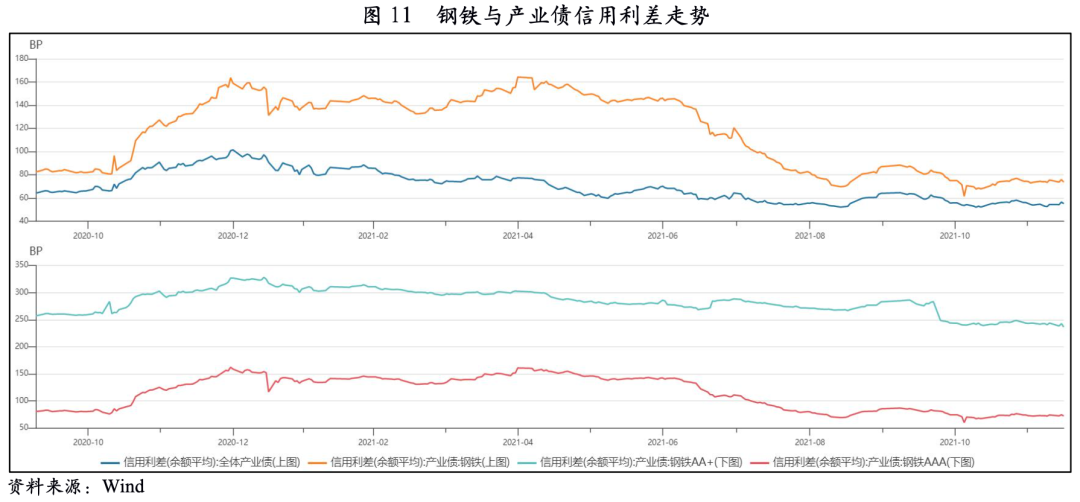 從發(fā)行成本來看,2021年初,由于鐵礦石價格大幅上漲,以及永煤違約事件引發(fā)的對強周期行業(yè)信用風險的擔憂,鋼鐵行業(yè)信用利差持續(xù)走擴。但二季度以來,隨著鋼鐵企業(yè)收入和利潤規(guī)模大幅增長,行業(yè)信用利差不斷收窄,且AAA鋼鐵債券信用利差降幅更為明顯。