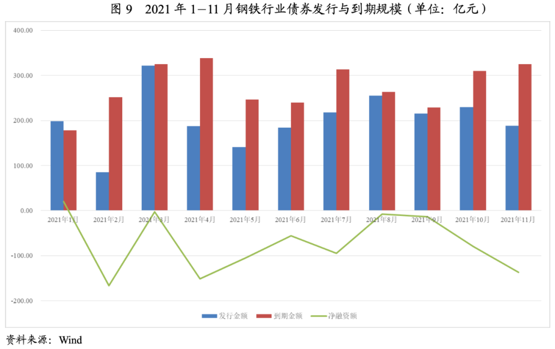 2021年以來,受益于經(jīng)營效益向好,鋼鐵企業(yè)發(fā)債規(guī)模同比下降,債券凈融資規(guī)模持續(xù)為負,且下半年信用利差明顯改善;2022年到期的鋼鐵債券規(guī)模不大,行業(yè)整體償債壓力較小。