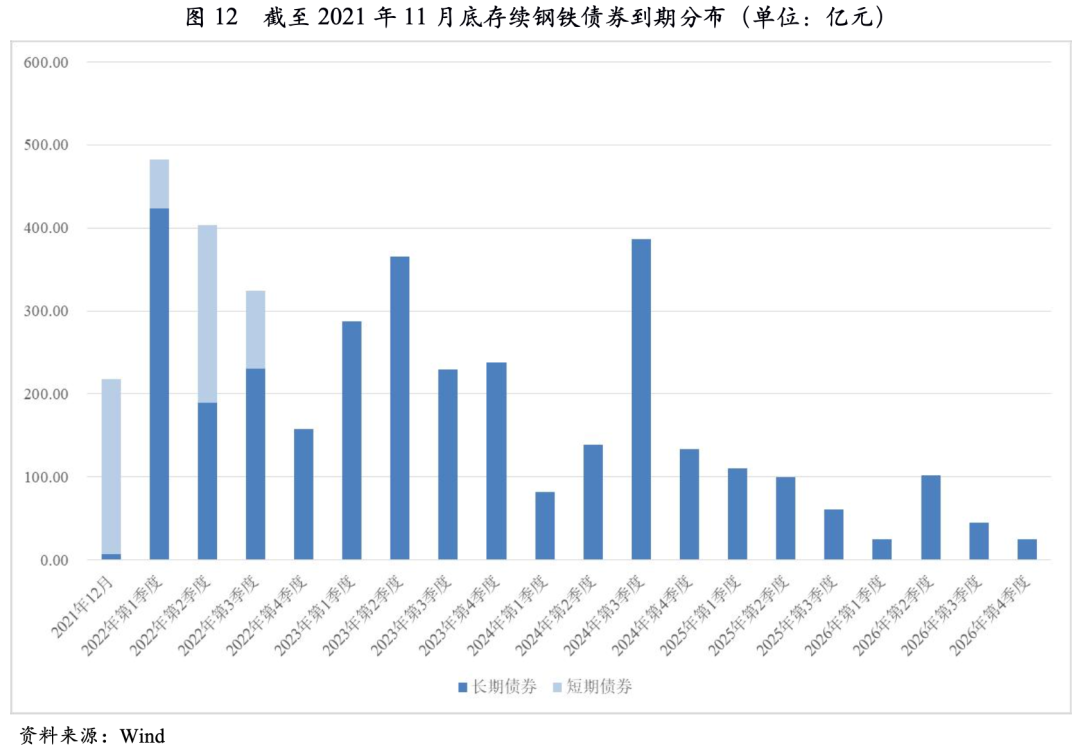 截至2021年11月底,鋼鐵企業(yè)存續(xù)債券余額合計3913.44億元,涉及發(fā)行主體37家,其中AAA主體23家、AA+主體11家、AA主體3家;一年內(nèi)到期債券規(guī)模1531.62億元,其中短期債券占37.67%、長期債券占62.33%,相較2021年以來新發(fā)債的規(guī)模尚可。考慮到鋼鐵企業(yè)發(fā)債以周轉(zhuǎn)為主,且發(fā)債企業(yè)主要為高信用等級的央企和地方國企,行業(yè)整體償債壓力較小。