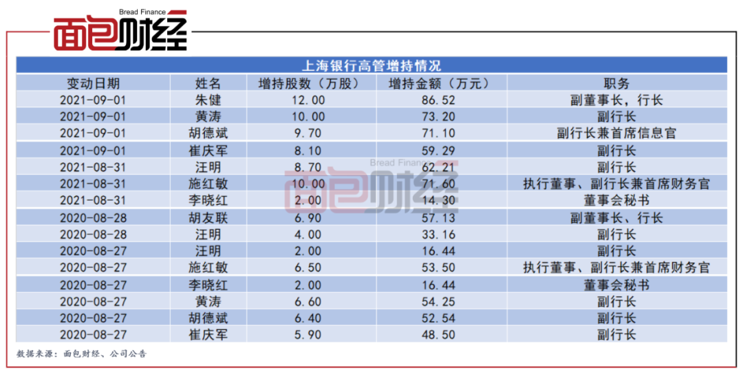 實際上,自疫情爆發(fā),上海銀行股價隨著整體銀行板塊而調整后,上海銀行高管就多次在二級市場增持公司股票。統(tǒng)計顯示,2020年8月末,上海銀行7位高管合計增持40.3萬股,合計增持金額為331.96萬元。
