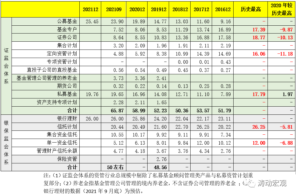 1、以2021年9月底的數(shù)據(jù)為例,證監(jiān)會(huì)體系下的資產(chǎn)管理行業(yè)規(guī)模合計(jì)達(dá)到65.87萬(wàn)億,銀保監(jiān)會(huì)體系下的資產(chǎn)規(guī)模亦有50萬(wàn)億左右,也即兩大體系的資產(chǎn)管理行業(yè)規(guī)模合計(jì)在110萬(wàn)億-120萬(wàn)億之間。