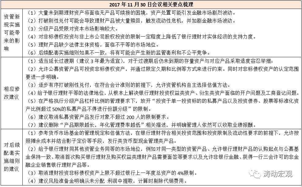 整體上看,本次專題會(huì)議的聚焦點(diǎn)主要包括(1)過(guò)渡期不夠;(2)期限錯(cuò)配不應(yīng)該限制;(3)非標(biāo)資產(chǎn)有其存在的必要性;(4)凈值型產(chǎn)品轉(zhuǎn)型短期內(nèi)存在困難,造成的沖擊較大;(5)《資管新規(guī)》部分細(xì)則還沒(méi)有明確等幾個(gè)方面。