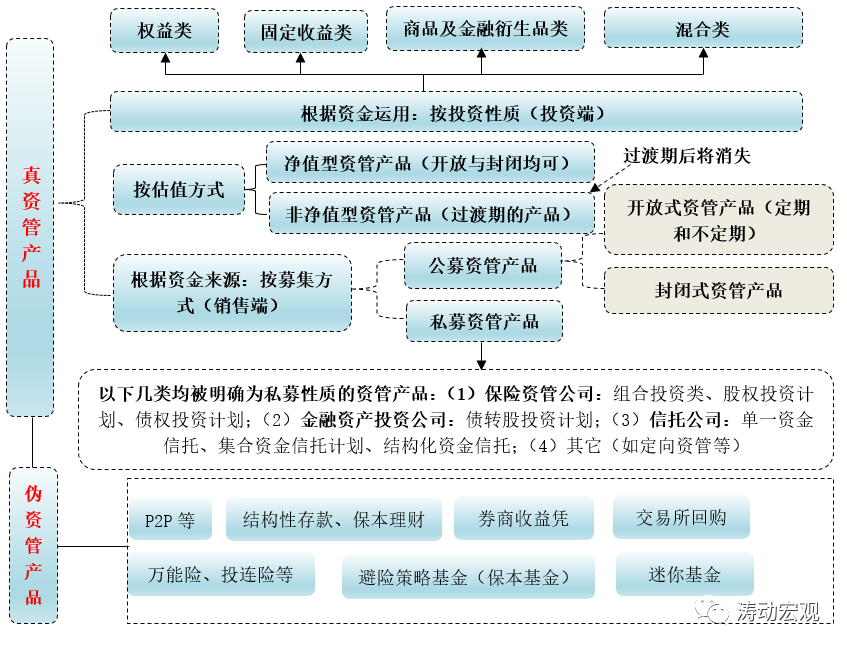 《資管新規(guī)》之前,大資管行業(yè)的產(chǎn)品分類比較繁雜。如銀行理財(cái)便有多種分類方式,如按發(fā)行對(duì)象劃分(即一般個(gè)人理財(cái)、高凈值理財(cái)、私人銀行理財(cái)、機(jī)構(gòu)理財(cái)、同業(yè)理財(cái));按是否保本劃分(保本理財(cái)和非保本理財(cái));按申購(gòu)特征劃分(開(kāi)放式與封閉式);按發(fā)行方式劃分(公募和私募);按設(shè)計(jì)特征劃分(分級(jí)與非分級(jí));按投資對(duì)象劃分(固定類、權(quán)益類、商品及衍生品類、混合類)等等。上述分類方式之間有一定重復(fù)甚至不合適宜的地方。