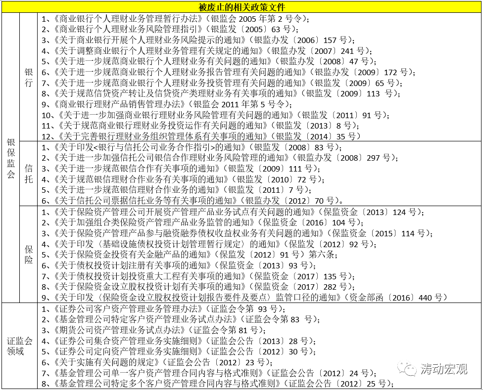《資管新規(guī)》后,大資管行業(yè)的政策格局已被重塑,之前相關(guān)的一系列政策文件大多已退出歷史舞臺(tái)(被廢止),具體看,銀行體系有12份政策文件被廢止(包括2013年的8號(hào)文和2014年的35號(hào)文)、信托體系有6份政策文件被廢止(待信托新規(guī)正式稿出臺(tái)后進(jìn)一步明確)、保險(xiǎn)體系有9份政策文件被廢止、證監(jiān)會(huì)體系有8份政策文件被廢止。
