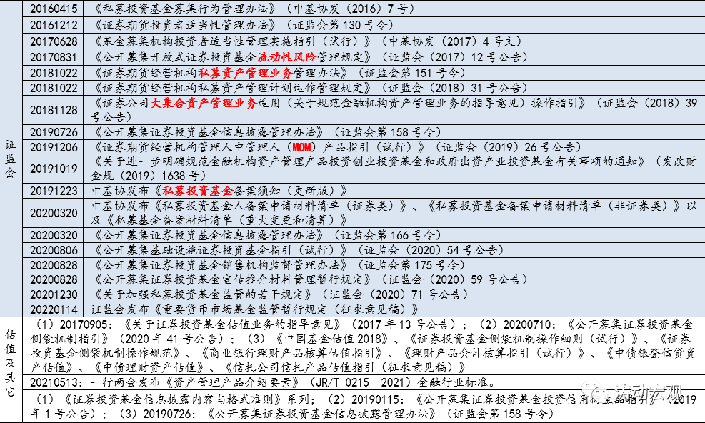 (3)證監(jiān)會(huì)的2017年12號(hào)公告、151號(hào)令、2018年31號(hào)公告和39號(hào)公告分別對(duì)公募基金(含貨幣基金)的流動(dòng)性風(fēng)險(xiǎn)(其流動(dòng)性風(fēng)險(xiǎn)管理方法同樣也被銀行理財(cái)?shù)荣Y管行業(yè)所借鑒)、私募資管以及公募資管的運(yùn)作進(jìn)行了規(guī)范。同時(shí)證監(jiān)會(huì)還發(fā)布了MOM產(chǎn)品指引、公開(kāi)募集基礎(chǔ)設(shè)施證券投資基金指引。