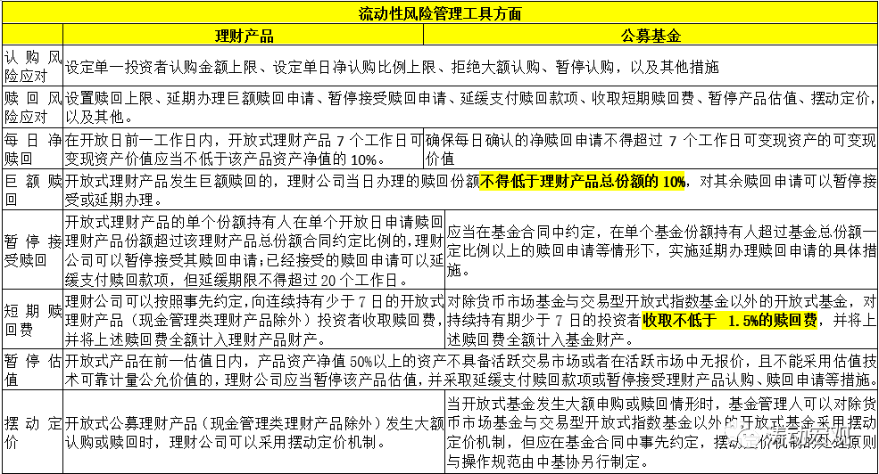 2、在贖回風(fēng)險(xiǎn)應(yīng)對(duì)方面,工具主要包括延期辦理巨額贖回申請(qǐng)、暫停接受贖回申請(qǐng)、延緩支付贖回款項(xiàng)、收取短期贖回費(fèi)、暫停產(chǎn)品估值、擺動(dòng)定價(jià)等。此外,理財(cái)產(chǎn)品的贖回風(fēng)險(xiǎn)應(yīng)對(duì)方面還包括設(shè)置贖回上限。