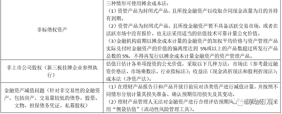 2、考慮到部分資產(chǎn)尚不具備以市值計(jì)量的條件,過(guò)渡期內(nèi)封閉期在半年以上的定期開(kāi)放式資管產(chǎn)品、銀行現(xiàn)金管理類理財(cái)產(chǎn)品(當(dāng)然這里也包括貨幣市場(chǎng)基金)適用攤余成本計(jì)量。