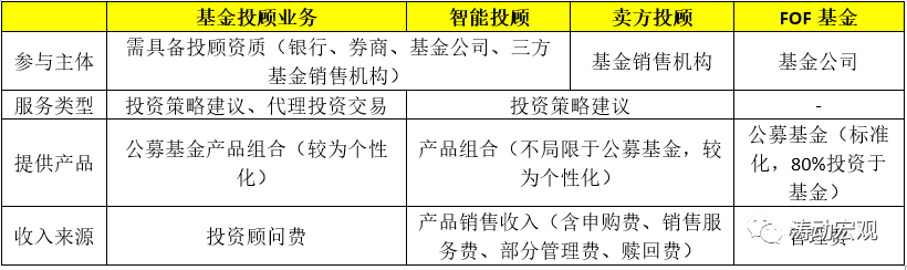 (3)目前大資管行業(yè)中,主要有基金投顧、FOF產(chǎn)品賣(mài)方投顧以及智能投顧等四種方式從事類似的投顧業(yè)務(wù),這四種模式具有一定差異,其中從事基金投顧、智能投顧的機(jī)構(gòu)需要取得投資顧問(wèn)資質(zhì)。