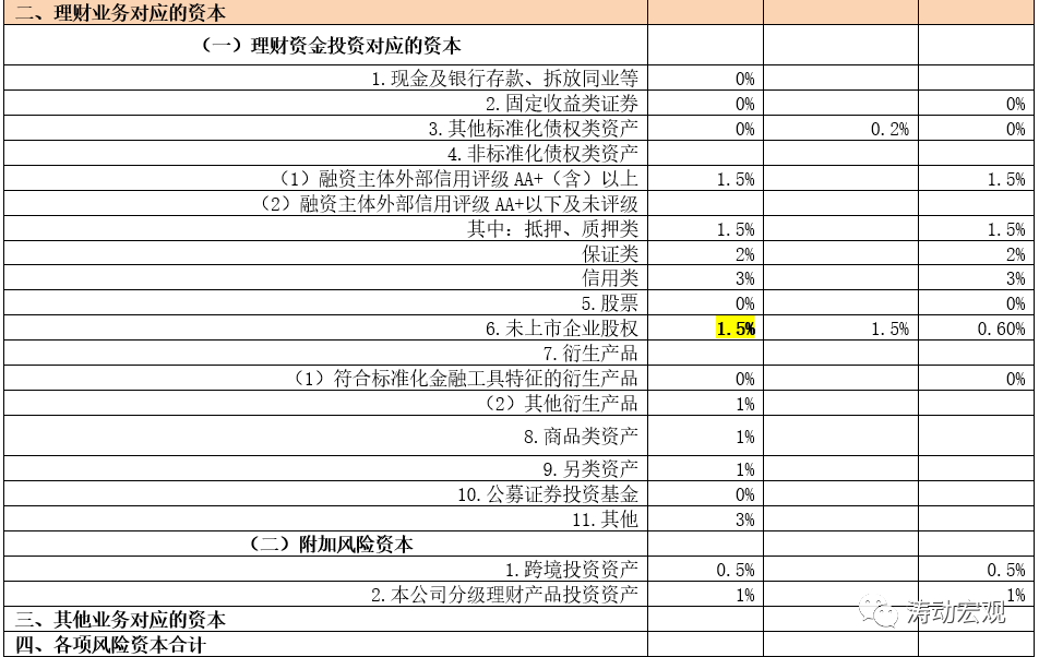 需要說(shuō)明的是,這里對(duì)未上市企業(yè)股權(quán)的風(fēng)險(xiǎn)系數(shù)設(shè)定理財(cái)子公司主要參照了信托公司(二者均為1.50%)。