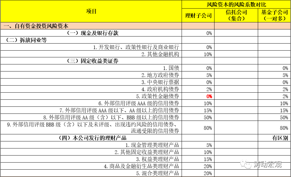 從自有資金來(lái)看,受限更多,但相對(duì)而言理財(cái)子公司自有資金能夠投資的品種要多于信托公司和基金子公司,但在風(fēng)險(xiǎn)系數(shù)設(shè)定上基本和基金子公司一致,且亦不鼓勵(lì)投向信用債以及自身發(fā)行的理財(cái)產(chǎn)品,明確鼓勵(lì)投向現(xiàn)金、利率債等、同業(yè)資金(主要指商業(yè)銀行及政策性銀行)等高流動(dòng)性的資產(chǎn)。2、理財(cái)子公司與基金子公司的風(fēng)險(xiǎn)系數(shù)設(shè)置的對(duì)比