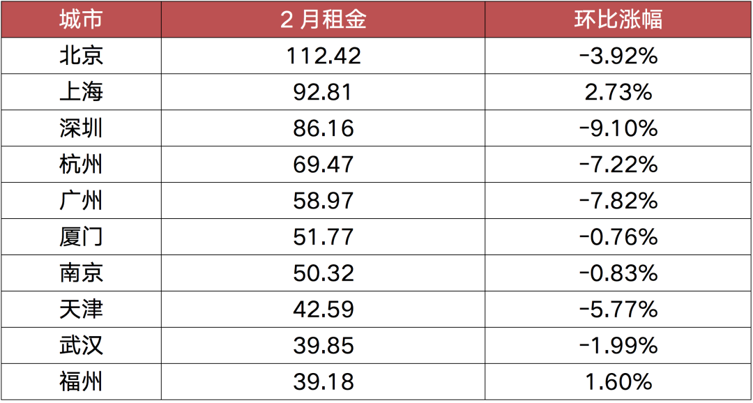 各城市之間租金水平分化,2月最低租金出現(xiàn)在河北保定,平均租金為16.31元/平方米/月。
