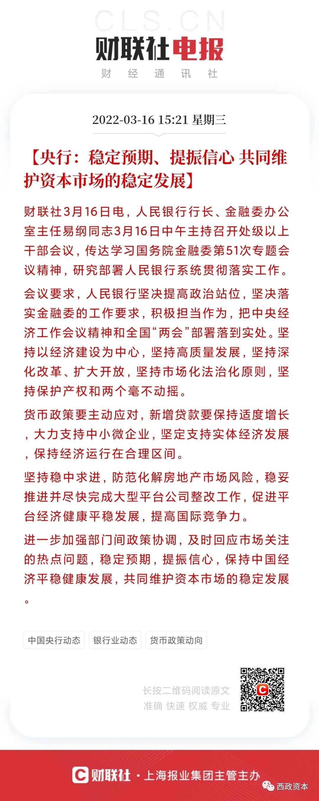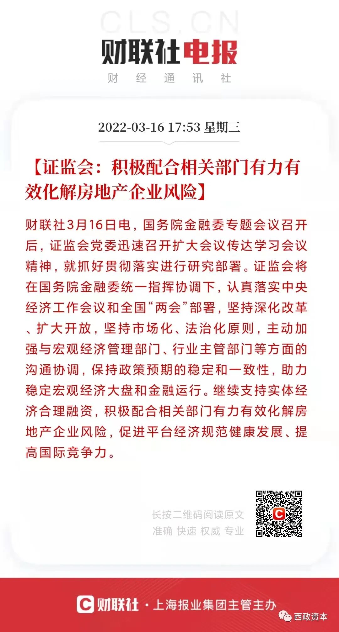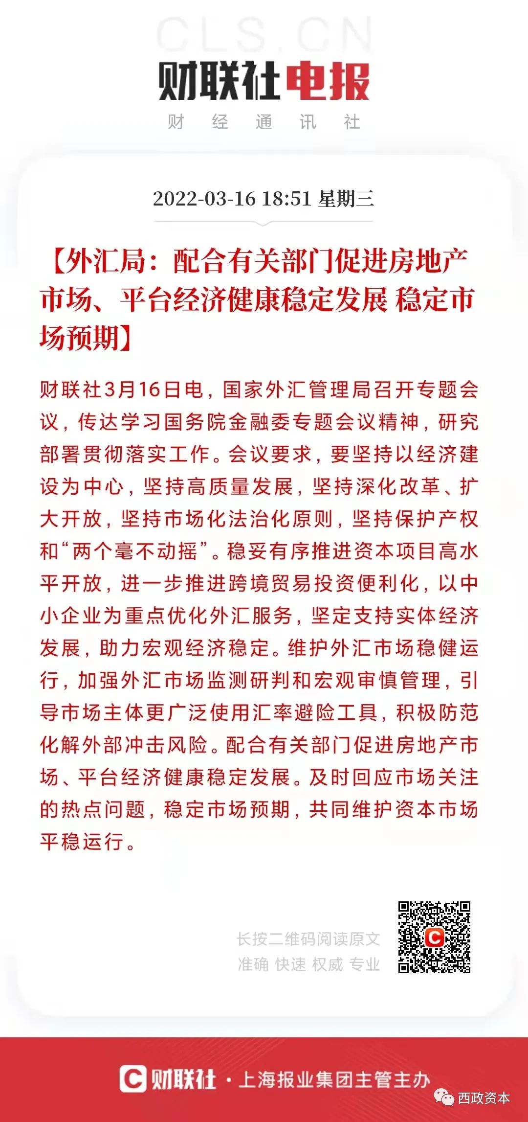 2022年3月16日上午,國務院金融穩定發展委員會召開專題會議,研究當前經濟形勢和資本市場問題。會議提出,“在當前的復雜形勢下,最關鍵的是堅持發展是黨執政興國的第一要務,堅持以經濟建設為中心”;會議強調,“有關部門要切實承擔起自身職責,積極出臺對市場有利的政策,慎重出臺收縮性政策”。隨后,央行、銀保監會、證監會、財政部、外管局等均積極表態維穩,并及時研究和提出有利有效的防范化解房地產風險應對方案。