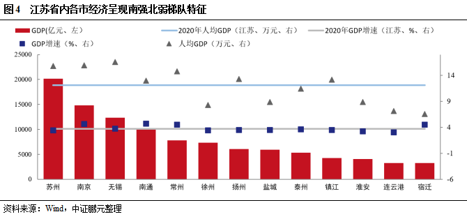 江蘇省內(nèi)各市經(jīng)濟(jì)呈現(xiàn)南強(qiáng)北弱梯隊(duì)特征。從經(jīng)濟(jì)總量看,蘇州、南京、無(wú)錫和南通均為萬(wàn)億GDP城市,經(jīng)濟(jì)體量大,鎮(zhèn)江、淮安、連云港及宿遷規(guī)模較小,均在5,000億以下,經(jīng)濟(jì)實(shí)力在省內(nèi)偏弱,但經(jīng)濟(jì)總量最小的宿遷市仍位列全國(guó)79位,其余各市在 5,000-8,000 億之間。從經(jīng)濟(jì)增速看,南京、南通、常州、宿遷2020年GDP增速快于江蘇省GDP增速,其余各市基本持平。從人均GDP來(lái)看,按常住人口計(jì)算,蘇南五市、南通和揚(yáng)州2020年人均GDP高于江蘇省人均GDP,其中無(wú)錫最高,達(dá)16.58萬(wàn)元,南京、蘇州分別為15.91萬(wàn)元和15.82萬(wàn)元;鹽城、淮安、徐州、連云港、宿遷人均 GDP 較低,低于10萬(wàn)元。