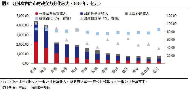 南京與蘇州財(cái)政實(shí)力絕對(duì)領(lǐng)先,鎮(zhèn)江、淮安、連云港和宿遷財(cái)政實(shí)力相對(duì)較弱;蘇南(除鎮(zhèn)江)財(cái)政自給率較高,宿遷、連云港、淮安、鹽城則處于較低水平;南通、常州、鹽城、徐州等地土地財(cái)政依賴(lài)度較高。2020年,蘇州、南京財(cái)政實(shí)力(一般公共預(yù)算收入+政府性基金收入+上級(jí)補(bǔ)助收入)強(qiáng),遠(yuǎn)超其他城市,分別達(dá)4,448.21億元和4,100.50億元,主要得益于發(fā)達(dá)的經(jīng)濟(jì)水平、較強(qiáng)的稅收產(chǎn)出能力和大規(guī)模的土地出讓?zhuān)粺o(wú)錫、南通、常州、徐州財(cái)政實(shí)力較強(qiáng),處于第二梯隊(duì),在1,500-2,500億元之間;鹽城、泰州、揚(yáng)州財(cái)政實(shí)力在省內(nèi)屬于一般水平,處于第三梯隊(duì),在1,000-1500億元之間;而宿遷、淮安、鎮(zhèn)江和連云港財(cái)政實(shí)力相對(duì)較弱,分別為826.70億元、798.35億元、783.47億元和680.19億元。質(zhì)量方面,各市稅收收入占一般公共預(yù)算收入的比例均在75%以上,一般公共預(yù)算收入質(zhì)量較高。財(cái)政自給率方面,蘇州、南京、無(wú)錫、常州財(cái)政自給率均在80%以上,財(cái)政自給率較高,而宿遷、連云港、淮安、鹽城財(cái)政自給率不足50%,處于較低水平。需關(guān)注的是,南通、常州、鹽城、徐州政府性基金收入占比超過(guò)60%,土地財(cái)政依賴(lài)度較高,在房地產(chǎn)下行周期中,其財(cái)政實(shí)力受到的影響更為明顯。