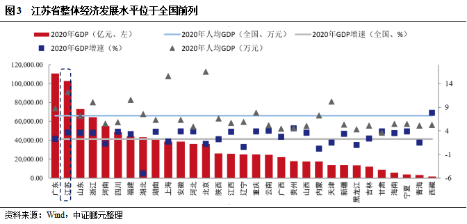 江蘇省整體經(jīng)濟(jì)發(fā)展水平較高。江蘇省與上海、浙江、安徽共同構(gòu)成長(zhǎng)三角經(jīng)濟(jì)圈,是中國(guó)發(fā)展程度最高的地區(qū)之一。從經(jīng)濟(jì)總量來(lái)看,2020年江蘇省GDP達(dá)10.27萬(wàn)億,位于全國(guó)第二,僅次于廣東省,占全國(guó)GDP總量的10.14%。從經(jīng)濟(jì)增速來(lái)看,2020年江蘇省GDP增速3.7%,受疫情影響有所下滑,2021年1-9月,GDP增速恢復(fù)至10.2%,同期全國(guó)GDP增速分別為2.3%、9.8%,均高于全國(guó)水平,經(jīng)濟(jì)發(fā)展動(dòng)能足。從人均GDP來(lái)看,按常住人口計(jì)算,2020年江蘇省人均GDP達(dá)12.2萬(wàn)元,是同期全國(guó)人均GDP的167.82%,排名全國(guó)第三。