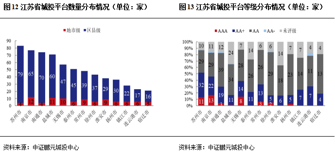 江蘇省城投數(shù)量居全國(guó)首位,各市城投平臺(tái)以區(qū)縣級(jí)為主,蘇南地區(qū)高等級(jí)平臺(tái)占比較高。本報(bào)告統(tǒng)計(jì)范圍內(nèi)的江蘇省城投平臺(tái)共650家,居全國(guó)首位。按地級(jí)市劃分,蘇州、南京、南通和鹽城城投平臺(tái)數(shù)量居多,分別為83家、77家、74家和71家。鎮(zhèn)江、連云港和宿遷城投平臺(tái)不足30家。其余各市平臺(tái)數(shù)量在30-60家之間。從行政級(jí)別來(lái)看,江蘇省各市城投平臺(tái)均以區(qū)縣級(jí)為主,區(qū)縣平臺(tái)數(shù)量占比均在70%以上。從平臺(tái)級(jí)別分布來(lái)看,AAA級(jí)平臺(tái)主要集中在蘇州、南京和無(wú)錫;鹽城、泰州、淮安未評(píng)級(jí)城投平臺(tái)數(shù)量較多。