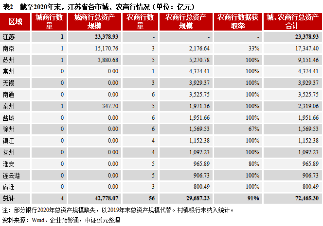 由于城農(nóng)商行貸款主要集中于本地,且對(duì)地方城投融資支持力度較大,與地方政府關(guān)系密切,出現(xiàn)突發(fā)事件時(shí)便于政府協(xié)調(diào)金融資源。具體來(lái)看,城商行方面,江蘇省內(nèi)共有4家城商行,分別是江蘇銀行、南京銀行、蘇州銀行和江蘇長(zhǎng)江商業(yè)銀行(靖江市)。江蘇銀行及南京銀行總資產(chǎn)規(guī)模均超萬(wàn)億元,蘇州銀行和江蘇長(zhǎng)江商業(yè)銀行總資產(chǎn)規(guī)模相對(duì)較小。農(nóng)商行方面,蘇州5家農(nóng)商行合計(jì)總資產(chǎn)規(guī)模超過(guò)5,000億元,其次是常州。南京共3家農(nóng)商行,分別是江蘇紫金農(nóng)商銀行、溧水區(qū)農(nóng)村商業(yè)銀行和高淳區(qū)農(nóng)村商業(yè)銀行,溧水區(qū)農(nóng)村商業(yè)銀行和高淳區(qū)農(nóng)村商業(yè)銀行總資產(chǎn)規(guī)模數(shù)據(jù)缺失,故南京農(nóng)商行總資產(chǎn)規(guī)模有所低估。整體來(lái)看,江蘇省銀行資源集中在蘇南地區(qū),省會(huì)南京城、農(nóng)商行總資產(chǎn)規(guī)模合計(jì)值超17,000億元,蘇州城、農(nóng)商行總資產(chǎn)規(guī)模合計(jì)值在9,000億元左右,其余地區(qū)城農(nóng)商行總資產(chǎn)規(guī)模合計(jì)值不足5,000億元。