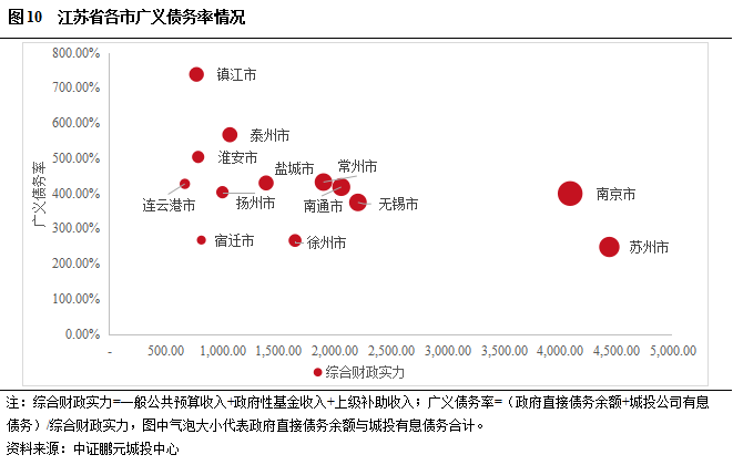 淮安、泰州、鎮(zhèn)江廣義債務(wù)率較高,債務(wù)負(fù)擔(dān)較重。從廣義債務(wù)規(guī)模(政府直接債務(wù)+城投有息債務(wù))來(lái)看,南京、蘇州廣義債務(wù)規(guī)模均超過(guò)萬(wàn)億,2020年末分別達(dá)18,430.71億元和11,006.77億元;其次分別為南通、無(wú)錫、常州、泰州、鹽城、鎮(zhèn)江,廣義債務(wù)規(guī)模在5,000-10,000億之間,其余依次為徐州、揚(yáng)州、淮安、連云港、宿遷,廣義債務(wù)規(guī)模在2,000-5,000億之間。從廣義債務(wù)率來(lái)看,蘇州、徐州、宿遷廣義債務(wù)率相對(duì)較低,在300%以?xún)?nèi);其次分別為無(wú)錫、南京、揚(yáng)州、南通、連云港、鹽城、常州,廣義債務(wù)率在300%-500%之間;淮安、泰州、鎮(zhèn)江廣義債務(wù)率較高,在500%-800%之間,債務(wù)負(fù)擔(dān)較重。
