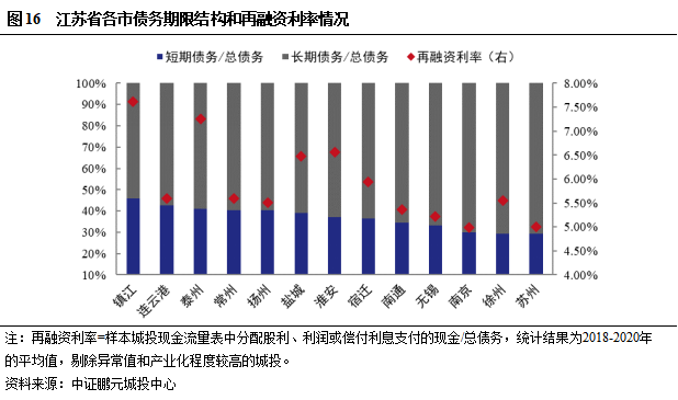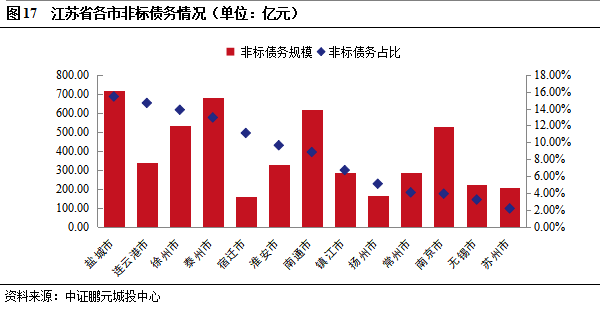 再融資利率差異明顯,非標(biāo)融資占比較高的區(qū)域債務(wù)循環(huán)壓力較大。經(jīng)中證鵬元測(cè)算,鎮(zhèn)江市、泰州市、淮安市、鹽城市城投再融資利率在6%以上,融資成本較高,而南京市和蘇州市融資利率低于5%,融資成本較低。從非標(biāo)占比來(lái)看,鹽城市、連云港、徐州、泰州、宿遷非標(biāo)債務(wù)占總債務(wù)的比例均超過(guò)10%,其中鹽城、連云港分別達(dá)15%和14%;