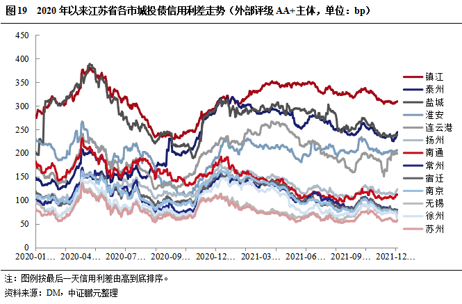 江蘇省各市城投債信用利差分化較為明顯,鎮(zhèn)江、泰州、鹽城、淮安、連云港城投信用利差較高,而蘇州、南京、無(wú)錫、常州、南通、揚(yáng)州城投信用利差相對(duì)較低,徐州和宿遷結(jié)構(gòu)分化較大,高等級(jí)(AA+)城投信用利差較低,低等級(jí)(AA)城投信用利差較高。鎮(zhèn)江、泰州、鹽城、淮安、連云港經(jīng)濟(jì)財(cái)政實(shí)力相對(duì)偏弱,城投平臺(tái)數(shù)量眾多,存在融資無(wú)序、政府管控不嚴(yán)等情況,債務(wù)規(guī)模較大,債務(wù)率較高,存在較大的償債壓力,其信用利差較高,反映了其風(fēng)險(xiǎn)補(bǔ)償情況。蘇南(除鎮(zhèn)江)、南通經(jīng)濟(jì)財(cái)政實(shí)力較強(qiáng),債務(wù)率尚可,金融資源豐富,信用利差較低。