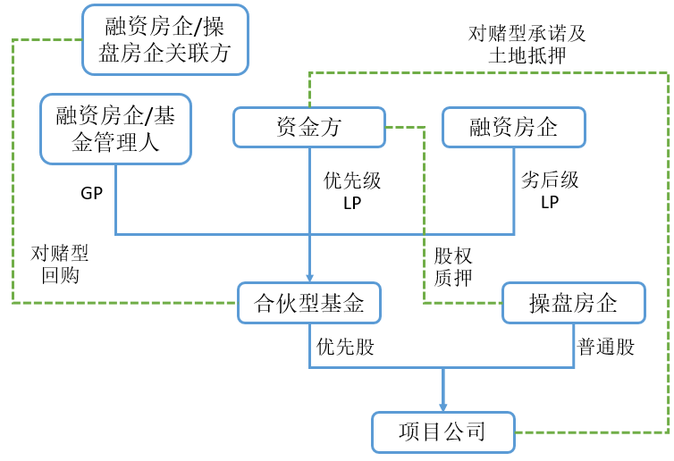 (3)融資房企和操盤房企關(guān)聯(lián)方可提供對賭型回購,回購合伙型基金持有項目公司的部分或全部股權(quán)。