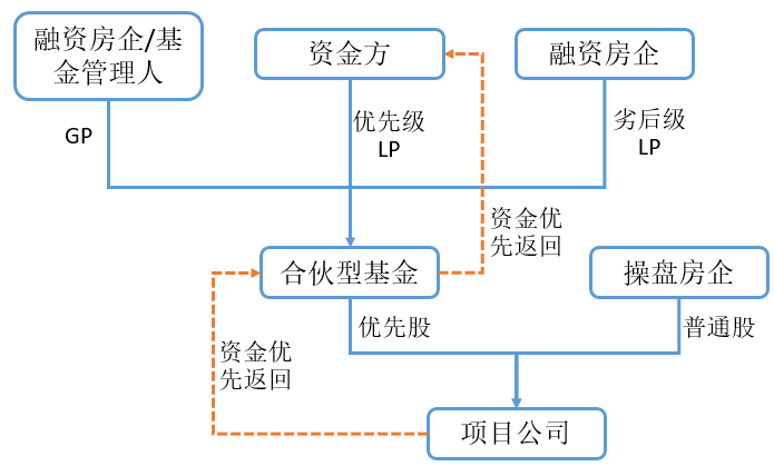 (1)資金方可通過自行設(shè)立或合作設(shè)立等方式,與融資房企和其他外部基金管理人共同設(shè)立合伙型地產(chǎn)基金,其中資金方可擔任合伙型地產(chǎn)基金優(yōu)先級LP,同時可根據(jù)底層項目需要決定是否擔任合伙型基金GP,融資房企擔任劣后級LP。合伙型基金設(shè)立后,與項目公司操盤房企共同持有項目公司,合伙型基金可視需要持有項目公司優(yōu)先股。
