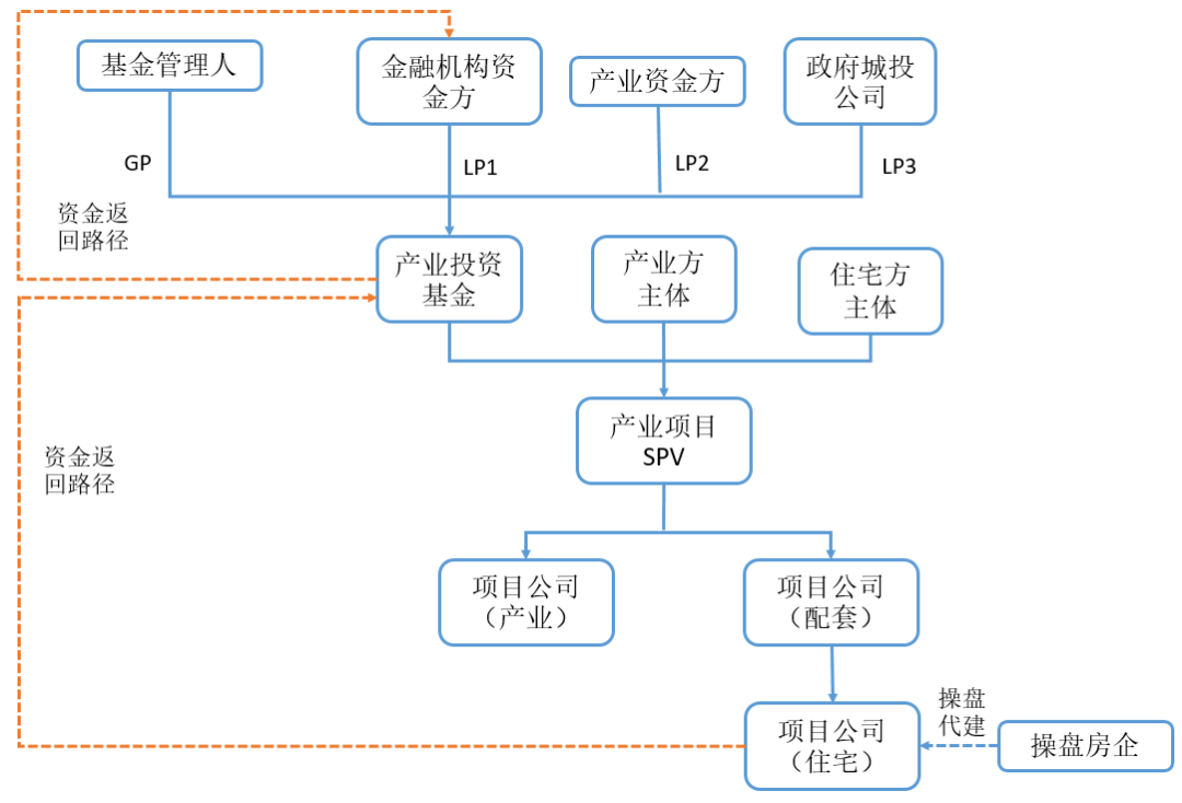 鑒于目前監(jiān)管機構(gòu)尚未對投資產(chǎn)業(yè)項目的基金做出類似其他地產(chǎn)基金的監(jiān)管規(guī)定,筆者認為,如部分涉及產(chǎn)業(yè)背景的地產(chǎn)項目(例如存在產(chǎn)業(yè)導(dǎo)入背景的勾地項目或大型產(chǎn)業(yè)園建設(shè)項目)等可利用產(chǎn)業(yè)基金進行融資,主要安排如下: