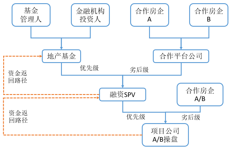 (2)資金路徑方面,資金方和融資房企應(yīng)當采用1:1等額比例,共同將資金投入合伙型基金。為確保資金方資金安全,融資房企的資金應(yīng)當先于資金方資金投入合伙型基金及項目公司,在項目后續(xù)開發(fā)期間融資房企與資金方共同承擔后續(xù)開發(fā)資金的補足義務(wù)。待項目公司開發(fā)完畢,項目公司完成利潤清算,優(yōu)先將利潤分配至合伙型基金及作為優(yōu)先級LP的資金方。
