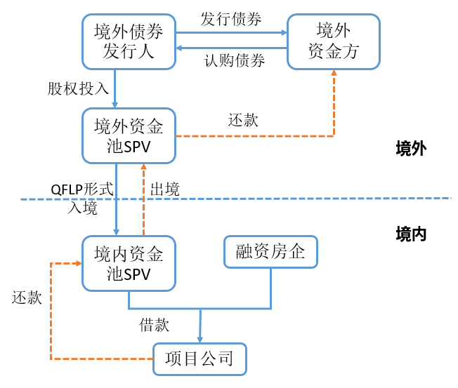 有融資需求的房企可在境外離岸港設(shè)立SPV作為境外債券發(fā)行人,向境外資金方發(fā)行私募債券,境外資金方認購私募債券后,境外發(fā)行人通過股權(quán)投資形式將資金投入境外資金池,境外資金池通過股權(quán)形式將資金投入境內(nèi)資金池,同時境內(nèi)資金池將資金投入境內(nèi)項目公司,融資及還款路徑如下圖所示: