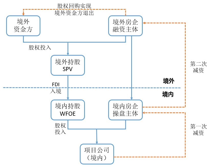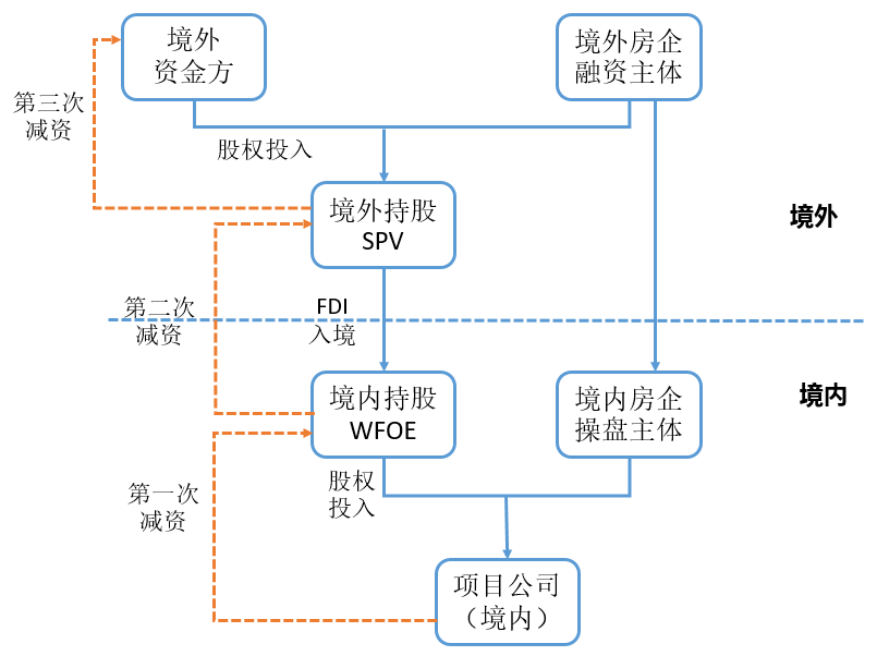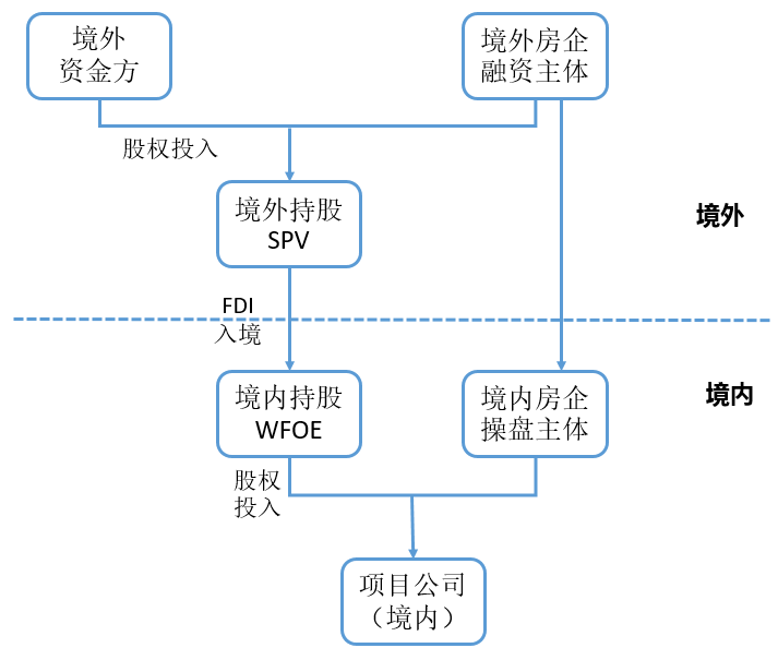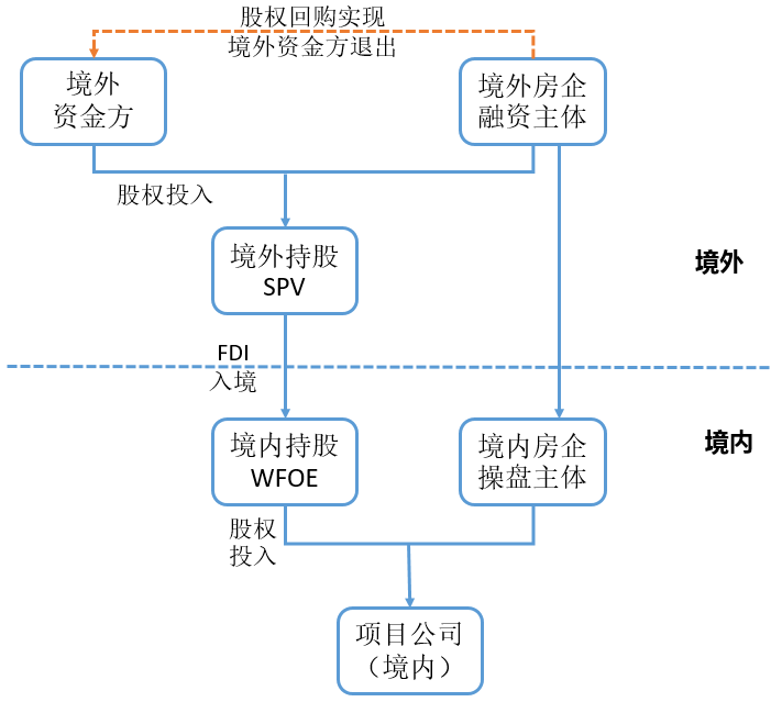 境外真股融資模式與境內(nèi)的真股融資模式路徑相同,同樣是由境外資金方與境外融資房企在境外設(shè)立SPV,雙方的資金由境外持股SPV通過FDI途徑將資金實繳至境內(nèi)持股外商投資企業(yè),隨后該境內(nèi)持股WFOE與境內(nèi)操盤房企主體共同持有項目公司股權(quán)并開發(fā)項目。資金的入境路線如下: