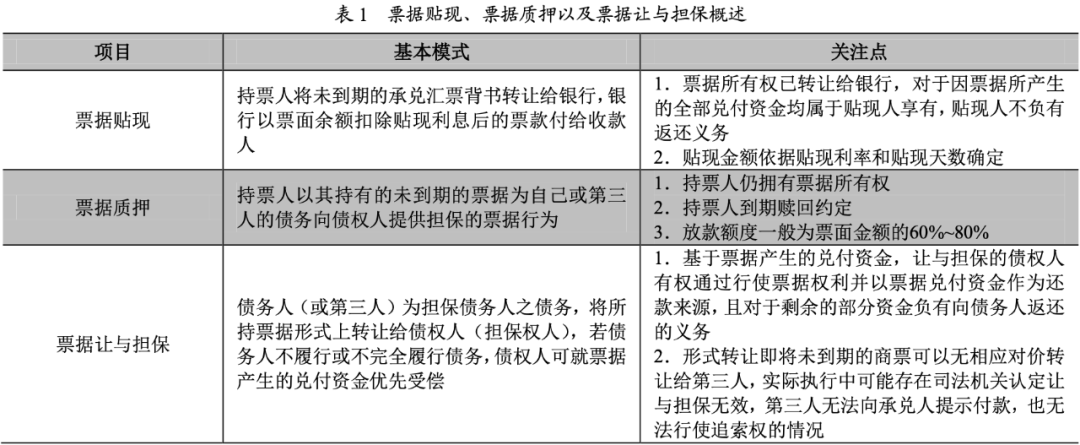 在我國實(shí)體經(jīng)濟(jì)發(fā)展過程中,對于中小企業(yè)來說,以票據(jù)貼現(xiàn)方式進(jìn)行融資手續(xù)簡單且融資成本較低,應(yīng)用較為普遍。在此基礎(chǔ)上,為免疑義,在進(jìn)入主要話題前,以下概念需要先進(jìn)行區(qū)分:票據(jù)讓與擔(dān)保、票據(jù)貼現(xiàn)以及票據(jù)質(zhì)押(具體內(nèi)容詳見下表)。