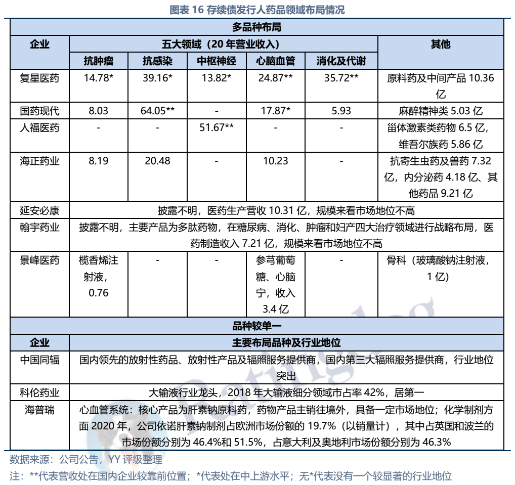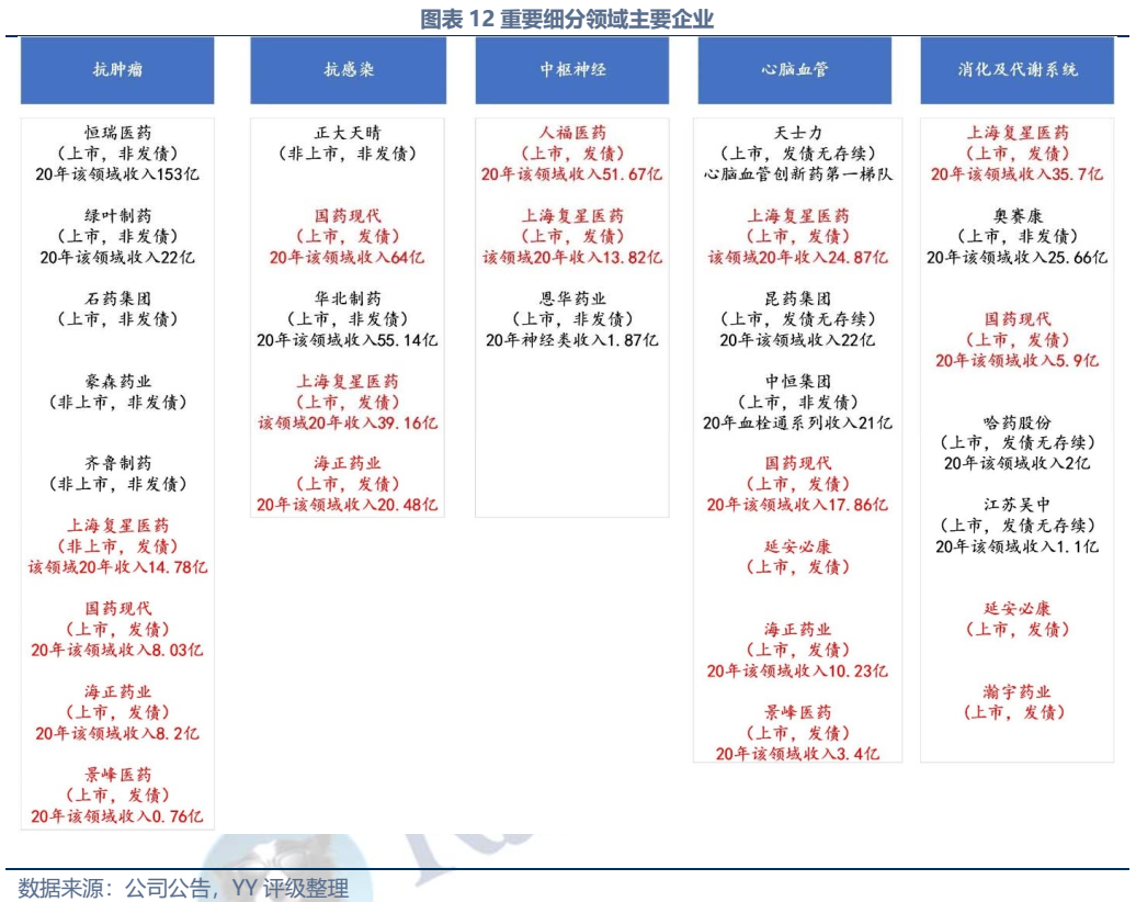 目前國內(nèi)醫(yī)藥市場仍主要以包括化學(xué)藥劑和生物藥在內(nèi)的西藥為主導(dǎo),且大部分以仿制藥為主。創(chuàng)新藥研發(fā)方面主要形成四大集群,不過整體在債市的存在感不高。競爭格局方面,抗腫瘤、抗感染、心血管、中樞神經(jīng)以及消化代謝系統(tǒng)領(lǐng)域占藥品市場規(guī)模60%以上,各領(lǐng)域企業(yè)眾多,具備一定市場地位的公司多為上市公司,如抗腫瘤領(lǐng)域主要有恒瑞醫(yī)藥、綠葉制藥、石藥集團(tuán)、泰森制藥,抗感染領(lǐng)域主要有正大天晴、國藥現(xiàn)代、華北制藥、復(fù)星醫(yī)藥、海正藥業(yè)。