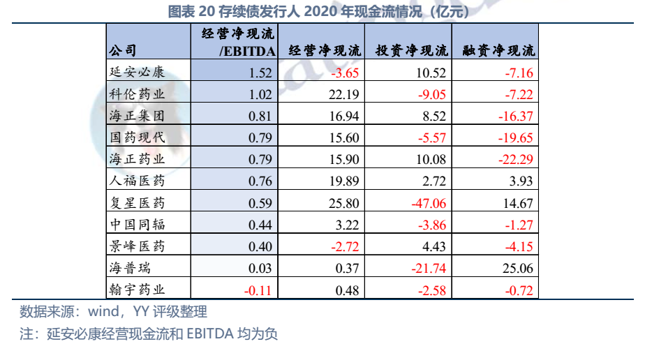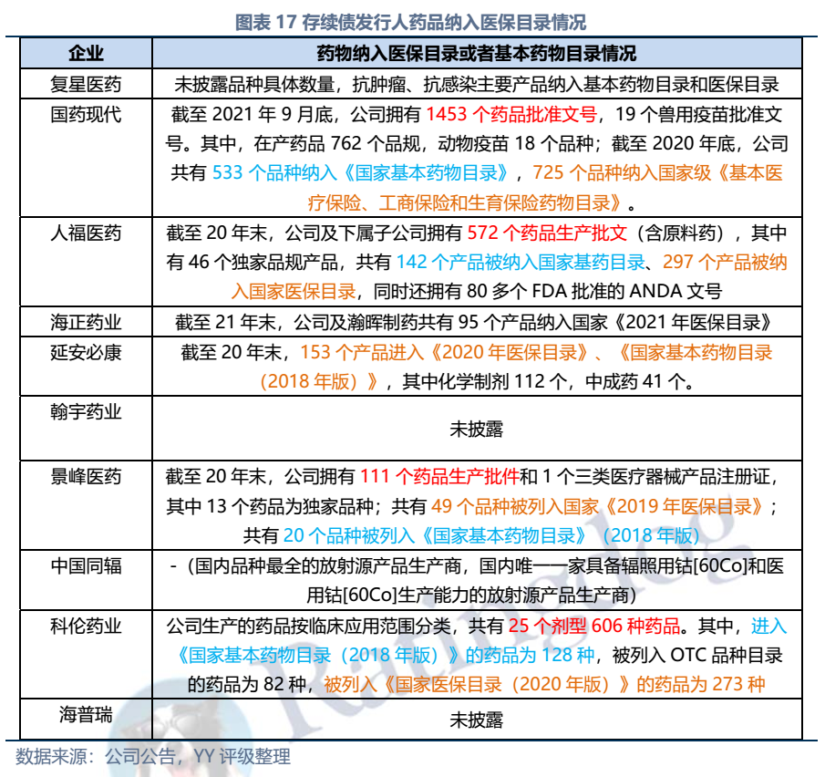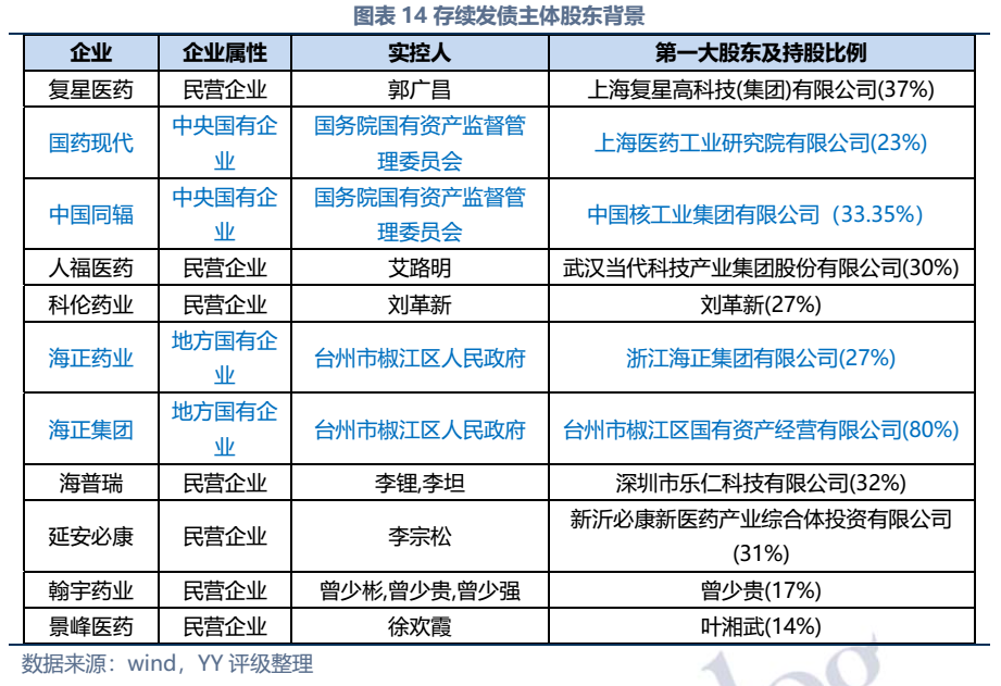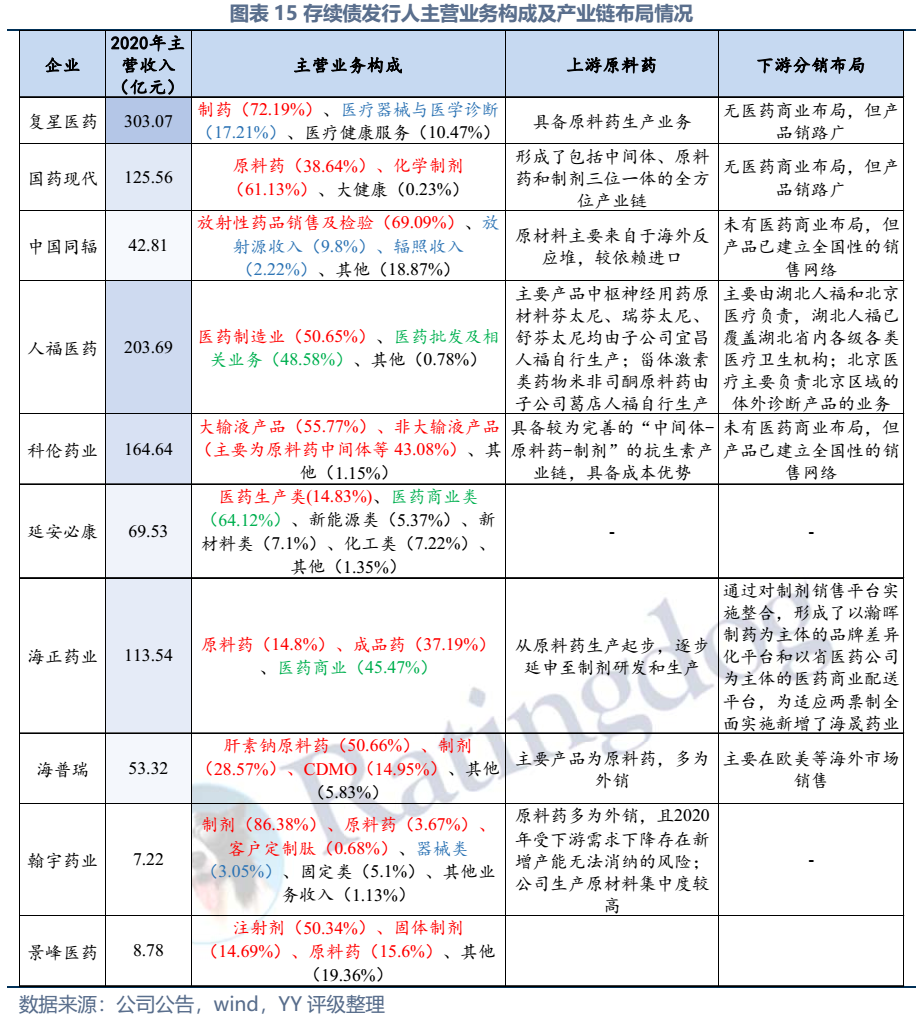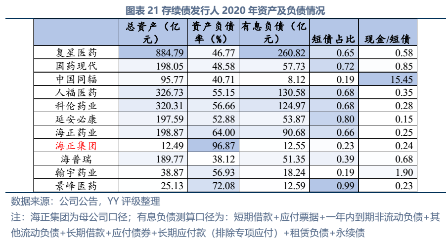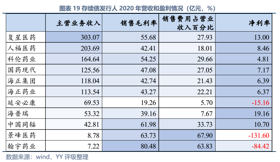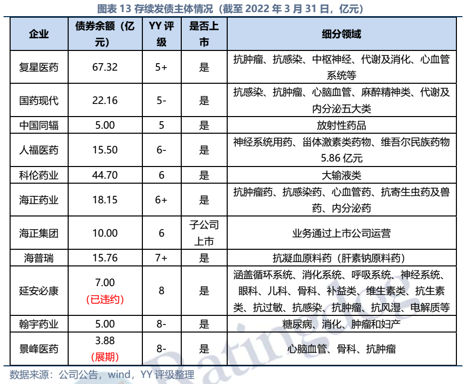 截至2022年3月末西藥行業(yè)發(fā)債主體存續(xù)債券余額僅214億元,存續(xù)債主體11家(含已違約的延安必康、已展期的景峰醫(yī)藥),具體來看:復(fù)星醫(yī)藥、國藥現(xiàn)代、人福醫(yī)藥、海正藥業(yè)、延安必康、翰宇藥業(yè)和景峰藥業(yè)擁有較多樣化的產(chǎn)品布局,復(fù)星醫(yī)藥(在抗感染、中樞神經(jīng)和消化系統(tǒng))、國藥現(xiàn)代(在抗感染、心腦血管)和人福醫(yī)藥(在心腦血管)具備較高的行業(yè)地位,中國同輻、科倫藥業(yè)和海普瑞產(chǎn)品則多聚焦于某一細(xì)分領(lǐng)域。財務(wù)方面,整體銷售毛利率較高(平均約50%),但銷售費用對利潤侵蝕較大(銷售費用/營收平均30%),存續(xù)發(fā)行人中除延安必康、景峰醫(yī)藥和翰宇藥業(yè)凈利潤出現(xiàn)虧損外,其他表現(xiàn)尚可;資產(chǎn)及負(fù)債方面,復(fù)星醫(yī)藥總資產(chǎn)顯著高于其他企業(yè),規(guī)模優(yōu)勢顯著;海正集團(tuán)本部杠桿率很高,需關(guān)注債務(wù)壓力;行業(yè)整體短債占比較高,存在一定流動性壓力。