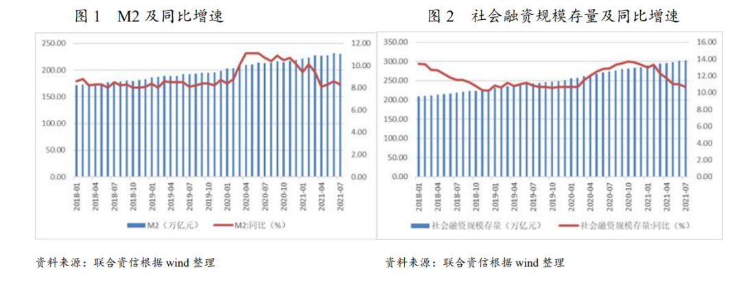 2021年以來(lái),隨著疫情逐步得到控制以及經(jīng)濟(jì)逐漸恢復(fù),央行的貨幣政策由“穩(wěn)增長(zhǎng)”向“防風(fēng)險(xiǎn)和調(diào)結(jié)構(gòu)并重”轉(zhuǎn)變,2021年上半年,M2和社會(huì)融資規(guī)模增速在經(jīng)歷了一季度的高點(diǎn)后逐步回落至疫情前水平。
